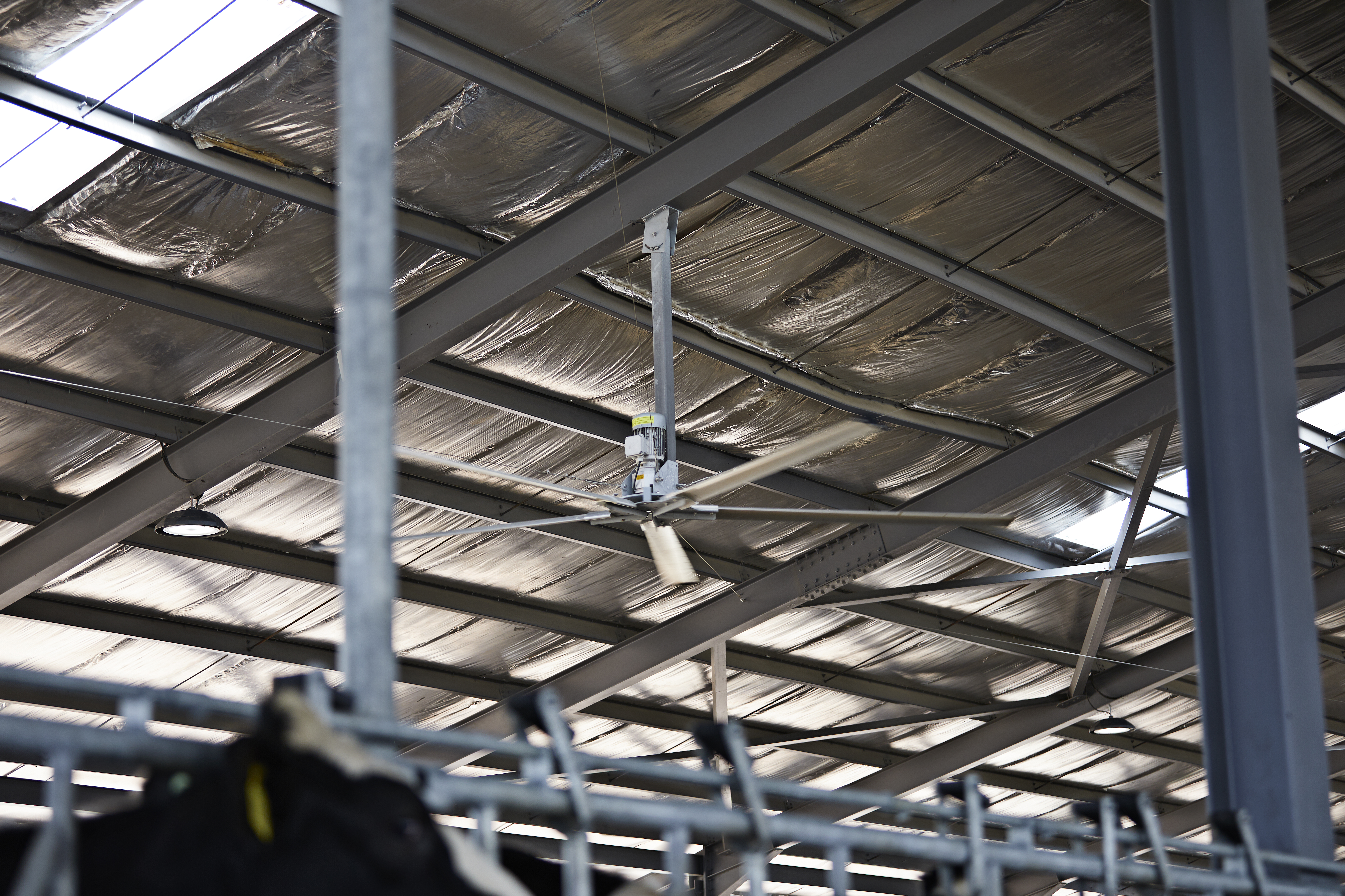 At the Arla farm, our primary focus is ensuring the comfort and well-being of our animals. To achieve this, we have designed the farm buildings to cater to these weather conditions. To keep our animals content, we have installed large ceiling fans, box fans, and sprinkler systems that can be activated as needed to provide cooling. The sprinkler system is specifically designed to spray water on cows in high milk production, and once they are wet, the box fans start operating, blowing air onto the cows. This process facilitates evaporation of the water from the cows' skin, simultaneously removing heat energy. Essentially, it functions as an air-conditioning system for our cows!